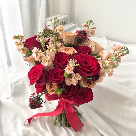 Fresh flower - Cappucino rose, red rose, matthiola, scabious and leaf.
