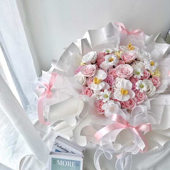 Fresh flower - Rose, carnation, phalaenopsis orchid, gardenia and chamomile ; Soap flower - ose, carnation, phalaenopsis orchid, gardenia and hana