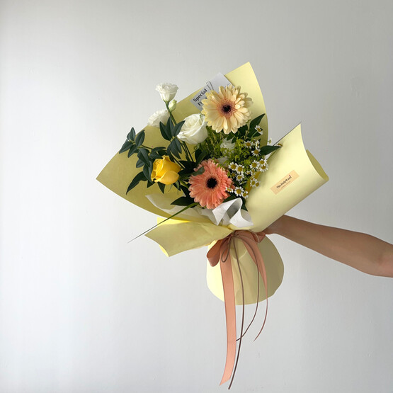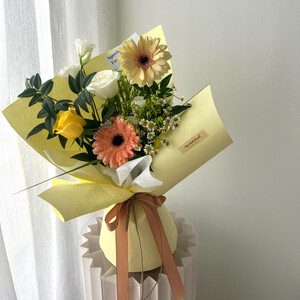 Fresh Flower - Rose, eustoma, gerbera, chamomile, lace flower, peacock and nine star leaves.