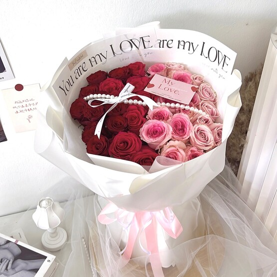 Fresh flower - 40 stalks mix roses in colour of red, ruby red, pink and blush | Ribbon deco