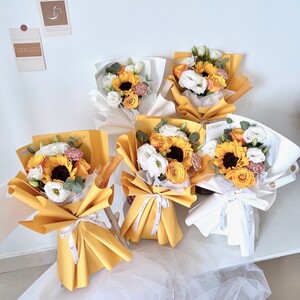 Fresh Flower - Sunflower, orange rose, eustoma, carnation and eucalyptus.