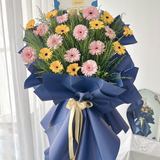 Fresh flower - Gerbera and peacock| Flower wood stand