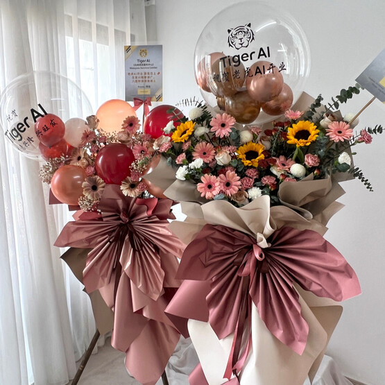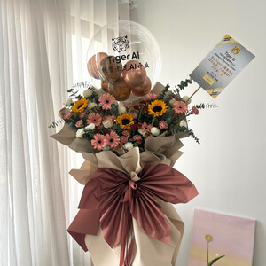 Fresh flower Design B - Spray colour rose, carnation, gerbera, baby breath and balloon | 18 inch Balloon | Flower wood stand